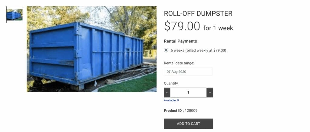Your customer can rent the dumpster and choose how often she will be billed for the rental (based on the settings you as the business offer). You can also select whether to collect the first rental payment right away or at the end of the first rental period (pre-paid or post-paid).